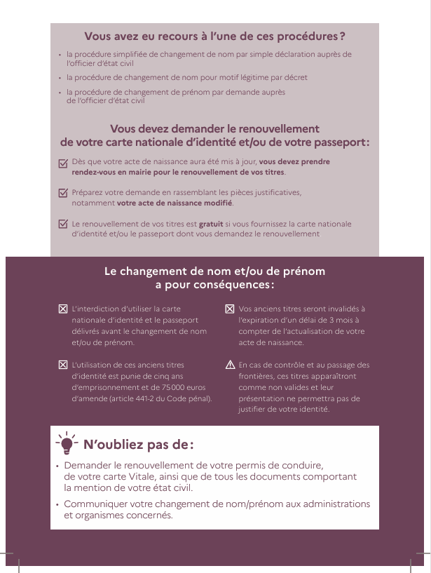 Après la réception de la notification de votre changement de nom/prénom, l’officier d’état civil de votre commune de naissance vous informera de l’actualisation de votre acte de naissance. Dès la réception de cette information, vous devrez déposer une demande de renouvellement de votre carte nationale d’identité et/ou de votre passeport auprès de la mairie de votre choix, même si leur durée de validité n’est pas expirée, en fournissant notamment de votre acte de naissance modifié.