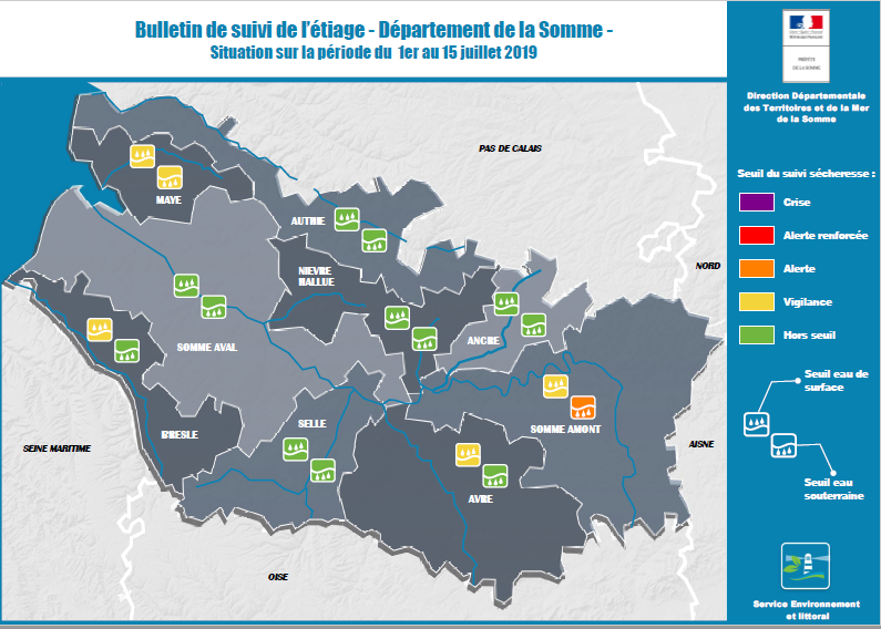 Vous trouverez ci-dessous l’arrêté préfectoral du 25 juillet 2019, constatant le franchissement de seuils de vigilance et prescrivant les mesures coordonnées de surveillance, de limitation et d’interdiction provisoires des usages de l’eau, sur les secteurs hydrographiques de la Somme Amont, de l’Avre et de la Bresle.